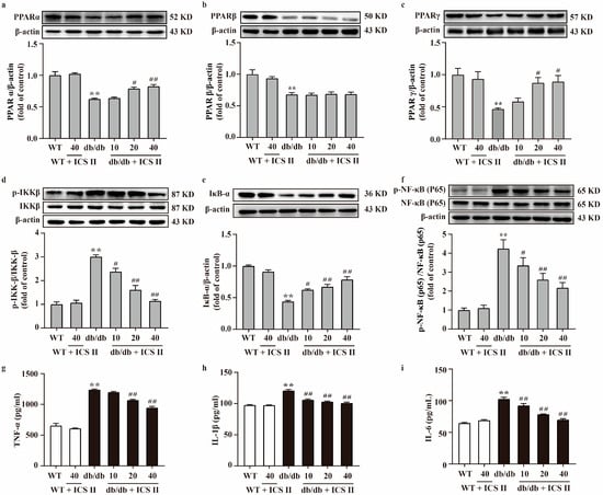 Effect of ICS II on the protein expressions of PPARα, PPARβ, PPARγ, and NF-κB signaling pathway in the liver of db/db mice. Representative western blot and quantitation of PPARα (a), PPARβ (b), and PPARγ (c) protein expressions in the liver (n = 5). (d) Representative western blot of phosphorylation of IKKβ protein level and quantitation of phosphorylation of IKKβ protein level in the liver. (e) Representative western blot of IκB-α protein expression and quantitation of IκB-α protein expression in the liver. (f) Representative western blot of phosphorylation of NF-κB (p65) protein level and quantitation of phosphorylation of NF-κB (p65) protein level in the liver (n = 5). Serum inflammatory factors were measured, including TNF-α (g), IL-1β (h), and IL-6 (i) (n = 8). Data were expressed as mean ± SEM. ** p < 0.01 versus WT group; # p < 0.05 and ## p < 0.01 versus db/db group.
