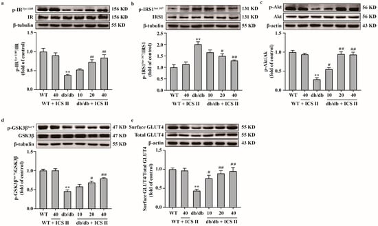 Because the IRS1/Akt signaling transduction pathway plays a critical role in insulin resistance, we further elucidated the effect of ICS II on the IRS1/Akt signaling transduction pathway. The results showed that the phosphorylation levels of IRTyr 1185, Akt and GSK3βSer 9 were significantly decreased and the phosphorylation level of IRS1Ser 307 was increased in db/db group compared with the WT group. However, ICS II significantly reversed these changes (Figure 6a–d). Moreover, the results showed that the expression of surface GLUT4 protein in liver tissue was increased in ICS II treated db/db mice than those of db/db mice, which indicated that ICS II promoted GLUT4 translocation in liver (Figure 6e). These findings suggest that ICS II attenuated insulin resistance by regulating IRS1/Akt signaling transduction pathway.
