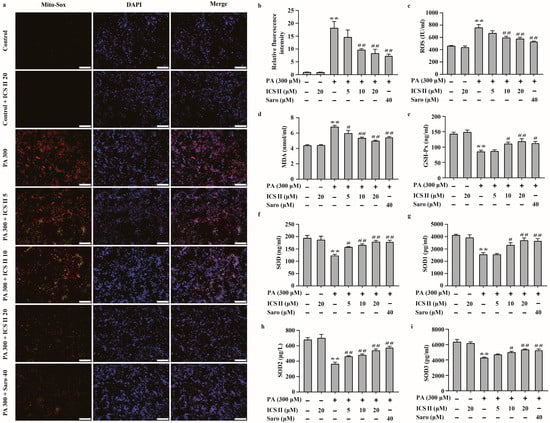 ICS II mitigated oxidative stress in PA-induced HepG2 cells. (a) Mito-SOX staining of HepG2 cells (×100, scale bar = 200 μm). (b) Relative fluorescence intensity (n = 5). (c) ROS level (n = 6). (d) MDA level (n = 6). (e) GSH-Px activity (n = 6). (f) SOD activity (n = 6). (g) SOD1 activity (n = 6). (h) SOD2 activity (n = 6). (i) SOD3 activity (n = 6). Data were expressed as mean ± SEM. ** p < 0.01 versus control group; # p < 0.05 and ## p < 0.01 versus PA 300 group.