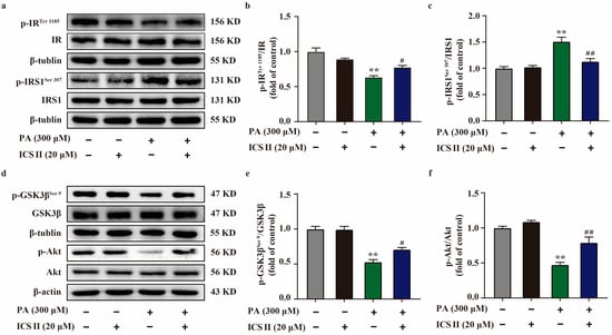 ICS II attenuated insulin resistance in PA-induced HepG2 cells by regulating the IRS1/Akt signaling transduction pathway. (a) Representative western blot of phosphorylation level of IRTyr 1185 and IRS1Ser 307. (b) Quantitation of phosphorylation level of IRTyr 1185 (n = 5). (c) Quantitation of phosphorylation level of IRS1Ser 307 (n = 5). (d) Representative western blot of phosphorylation level of GSK3βSer 9 and Akt. (e) Quantitation of phosphorylation level of GSK3βSer 9. (f) Quantitation of phosphorylation level of Akt (n = 5). Data were expressed as mean ± SEM. ** p < 0.01 versus control group; # p < 0.05 and ## p < 0.01 versus PA 300 group.