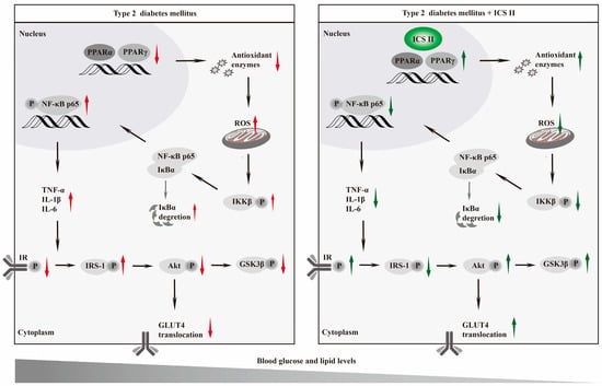 Accumulating evidence suggests that oxidative stress and inflammation play major roles in the development of T2DM [,]. Under normal physiological conditions, the production of ROS and elimination of ROS by antioxidant enzymes (such as catalase, SOD, and GSH-Px) are balanced to maintain the redox status. Under T2DM stimuli, the redox equilibrium is broken and excessive ROS impairs lipid and glucose metabolism, leading to hepatic steatosis, insulin resistance, and hyperglycemia []. Additionally, excessive ROS also provoke the activation of NF-κB signaling and inflammatory cascade to orchestrate the occurrence of T2DM. Under resting state, NF-κB (p50/p65) heterodimers are bound to IκB-α in the cytoplasm. Upon excessive ROS stimuli, IKK was activated and subsequently phosphorylates and degraded the IκB-α, which facilitates NF-κB translocates into the nucleus and initiates the release of proinflammatory cytokines []. Our findings demonstrated that ICS II significantly restored the redox balance and inhibited inflammatory response through mediation of NF-κB signaling pathway.