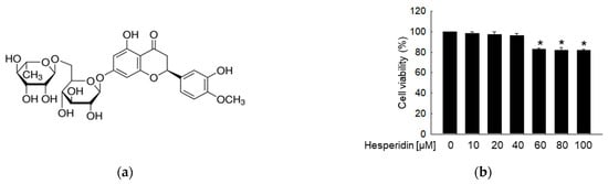 Hesperidin (Figure 1a), glucose, N−acetylcysteine (NAC), 2′,7′−dichlorodihydrofluorescein diacetate (H2DCFDA), avidin−tetramethyl−rhodamine isothiocyanate (TRITC) conjugate, and actin were obtained from Sigma−Aldrich (St. Louis, MO, USA). 5,5−Dimethyl−1−pyrroline−N−oxide (DMPO) was purchased from Cayman Chemical (Ann Arbor, MI, USA). Fluo−4 acetoxymethyl ester (Fluo−4 AM) and Rhod−2 AM were purchased from Molecular Probes (Eugene, OR, USA). Hoechst 33342 was provided by Biomol GmbH (Hamburg, Germany). Inhibitors of U0126 and SP600125 were provided from Merck KGaA (Darmstadt, Germany) and Tocris (Ellisville, MO, USA), respectively. Primary antibodies against phospho−H2A.X (Ser139), C/EBP homologous protein (CHOP), caspase−9, caspase−3, phospho−extracellular signal−regulated kinase (ERK), phospho−c−Jun N−terminal kinase (JNK), and JNK were purchased from Cell Signaling Technology (Beverly, MA, USA). Primary antibodies against Bcl−2, Bcl−2−associated X protein (Bax), phospho−protein kinase R−like ER kinase (PERK), phospho−eukaryotic initiation factor 2 alpha (eIF2α), and ERK2 were purchased from Santa Cruz Biotechnology (Dallas, TX, USA). Anti−IgG secondary antibodies were purchased from Invitrogen (Rockford, IL, USA). All other chemicals and reagents used were of analytical grade.