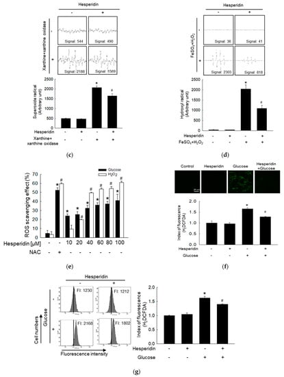 The ability of hesperidin to inhibit high glucose−induced intracellular ROS production was investigated using H2DCFDA. Cells were seeded in a 96−well plate at 1 × 105 cells/mL and treated with hesperidin (10, 20, 40, 60, 80, or 100 μM) or NAC (1 mM) for 16 h after seeding. After 30 min, 50 mM glucose was added to each well. The cells were cultured for an additional 30 min and the fluorescence of H2DCFDA was detected using a GloMax®−Multi Base Instrument (Promega, Madison, WI, USA). Similarly, cells stained with H2DCFDA were detected via FV1200 confocal microscopy (Olympus, Tokyo, Japan) and flow cytometry (Becton Dickinson, Mountain View, CA, USA) [22].