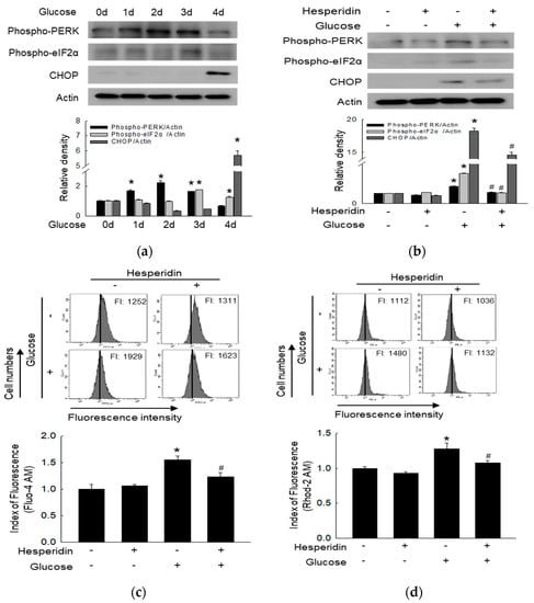 Hesperidin mitigated high glucose−induced ER stress in SH−SY5Y neuronal cells. (a,b) Phospho−PERK, phospho−eIF2α, and CHOP were detected via western blot. (c) ER calcium levels were analyzed by Fluo−4 AM dye. (d) Mitochondrial calcium levels were measured by Rhod−2 AM dye. * p < 0.05 and # p < 0.05 compared to control cells and glucose−exposed cells, respectively.
