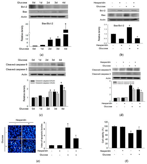 The Bcl−2 was suppressed, while Bax was upregulated by glucose in a time−dependent manner, which represented antiapoptotic proteins and proapoptotic proteins, respectively (Figure 4a). However, hesperidin treatment reversed these expression changes (Figure 4b). Apoptosis effectors caspase−9 and caspase−3 were activated by glucose over time (Figure 4c), which was suppressed by the treatment with hesperidin (Figure 4d). The inhibition apoptotic effect of hesperidin was confirmed through the observation of glucose−induced apoptotic bodies via Hoechst 33342 staining, which was reversed by hesperidin (Figure 4e). Finally, glucose suppressed cell viability, once again reversed by hesperidin treatment (Figure 4f). Taken together, hesperidin suppressed glucose−induced neuronal apoptosis.