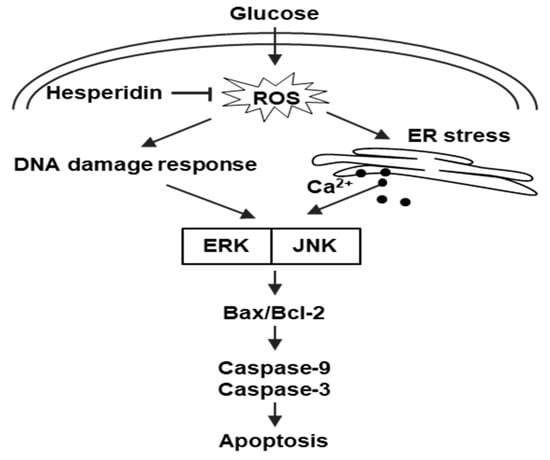 Schematic diagram of hesperidin’s protective effects against high glucose−induced SH−SY5Y neuronal cell death. Glucose−induced ROS in neuronal cells cause DNA damage and ER stress, in turn triggering apoptosis. However, hesperidin suppresses ROS levels and protects cells from apoptosis through inhibition of the MAPK signaling pathway.