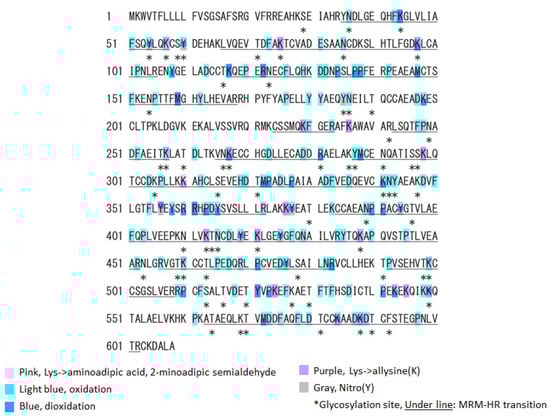 The high-resolution multiple reaction monitoring (MRM-HR) method was used to profile oxidative modification of serum albumin. On the basis of the information-dependent acquisition results (data not shown), an assay for MRM-HR experiments was developed using the Skyline software program (MacCoss Lab, University of Washington, Seattle, Washington, DC, USA). The transitions of MRM-HR are shown in Supplementary Table S1. All peak pickings were manually checked after automated matching. The peak areas obtained were normalized by calculating the relative abundance of each modified peptide using the corresponding non-modified peptide.