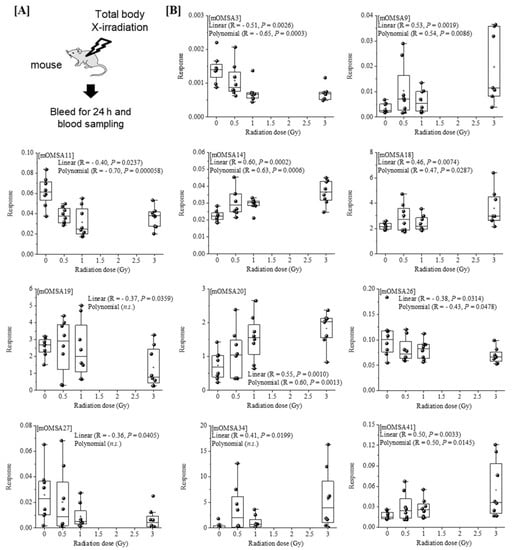 Correlation between the oxidative modification sequence of MSA with single TBI and the radiation dose in vivo model. [A] Eight-week-old female C57BL/6JJcl mice were exposed to varying TBI doses of 0, 0.5, 1 or 3 Gy of X-rays. Peripheral blood was harvested 24 h after TBI from the orbital venous plexus of mice (in vivo model). [B] Eleven sequences that showed significant dose-dependent correlations by linear or curve fitting are shown. Five sequences (mOMSA3, mOMSA9, mOMSA14, mOMSA20 and mOMSA41) showed a correlation coefficient (r value) of >0.5. p values of <0.05 were considered statistically significant.