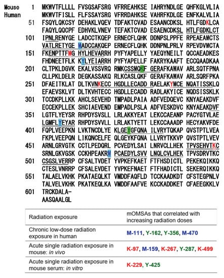 Based on the results of our previous report [], the oxidative modification sites of MSA obtained in this study were compared with the results of humans with chronic low-dose radiation exposure (Figure 5). Among the identified amino acid sequences of mouse albumin, lysine, methionine and tyrosine underwent dose-dependent oxidative modification. In particular, half of the oxidative modifications occurred at lysine, unlike in the case of human albumin (Table below in Figure 5). These results indicate that the profile of OMSA induced by radiation exposure is quite different between mice and humans.