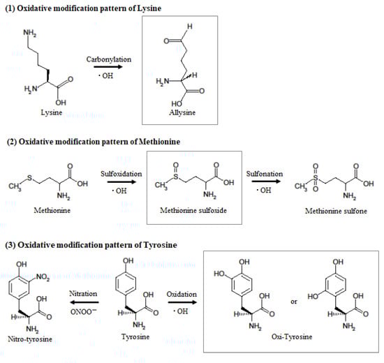 We used the Origin Pro 2020b software program (Northampton, MA, USA) for Windows to perform the linear and polynomial correlation analysis. Furthermore, the data were analyzed with a one-way ANOVA and Tukey-Kramer or Bonferroni/Dunn multiple comparison tests. Statistical significance in the analysis was all tested using a two-sided p value of 0.05. The oxidation modification patterns of amino acids were drawn using BKChem, a freely available chemical drawing program.