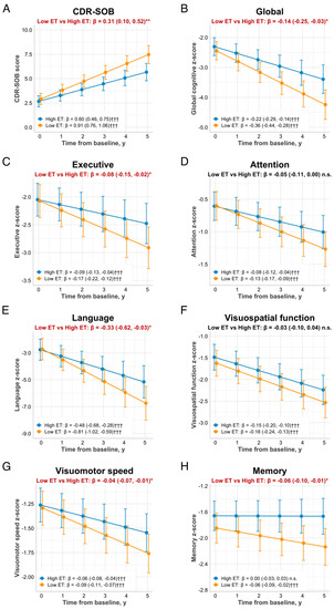 Global cognitive function decreased in both low and high ET groups over time, with significantly higher rates among patients with low baseline ET levels (β: −0.14, 95% CI: −0.25, −0.03; p = 0.012 vs. the high ET group, Figure 2B). There were trends towards faster rates of decline in the low ET group in all individual cognitive domains (β ranges from −0.33 to −0.04; all p < 0.05 vs. the high ET group) except for attention (which reached borderline significance of p = 0.057) and visuospatial function (Figure 2C–H). When ET levels were analyzed as a continuous variable, similar associations between baseline ET levels and longitudinal cognitive decline across multiple domains were observed (Table 3). When stratified by dementia status, the association of low baseline ET and declining cognitive function was only observed among non-demented patients, specifically in the visuomotor speed domain (p = 0.018, Supplementary Figure S3G). Although scores in global cognition decreased more steeply in non-demented patients with low ET (with a mean range of −0.21 to −0.07) compared to those with high ET (with a mean range of −0.11 to 0.00), the difference in rates of decline between the two groups did not reach significance (p = 0.081, Supplementary Figure S3B). In the dementia subgroup, there were no significant associations between baseline ET and cognitive decline (Supplementary Figure S3 and Table S3).