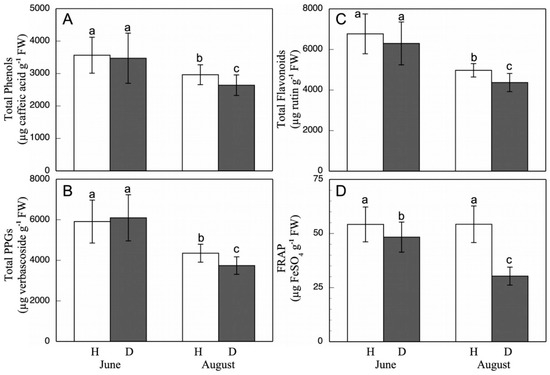 Total phenol (A), PPG (B), and flavonoid (C) contents, and FRAP (D) in grapevine healthy (H) and esca-diseased (D) leaves from June and August. The data are means ± SD from 10 independent experiments, each carried out in triplicate (different letters indicate significant differences at p < 0.05, Mann–Whitney U test).