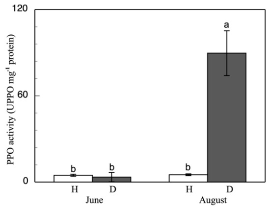 PPO activity in grapevine healthy (H) and esca-diseased (D) leaves from June and August. The data are means ± SD from 10 independent experiments, each carried out in triplicate (different letters indicate significant differences at p < 0.05, Mann–Whitney U test).