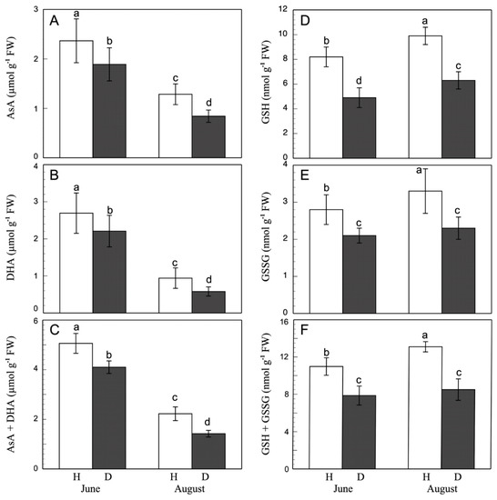 AsA (A), DHA (B), ascorbate pool (C), GSH (D), GSSG (E), and glutathione pool (F) in grapevine healthy (H) and esca-diseased (D) leaves from June and August. The data are means ± SD from 10 independent experiments, each carried out in triplicate (different letters indicate significant differences at p < 0.05, Mann–Whitney U test).