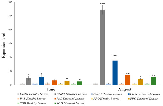 Transcript accumulation in grapevine healthy leaves vs. esca-diseased leaves, from June and August. Quantitative PCR in ChaS, ChaS3, PAL, PPO, and SOD of both types (healthy and esca-diseased plants) to quantify ChaS, ChaS3, PAL, PPO, and SOD transcripts. Significant differences by Student’s t-test between each transgenic line and Col-0 are marked (* p < 0.05; ** p < 0.05 ∩ p ≥ 0.001; *** p < 0.001).