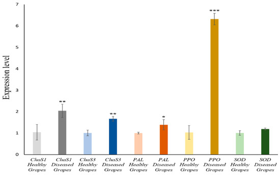 Transcript accumulation in grapevine healthy leaves vs. esca-diseased grapes, from October. Quantitative PCR in ChaS, ChaS3, PAL, PPO, and SOD of both types (healthy and esca-diseased plants) to quantify ChaS, ChaS3, PAL, PPO and SOD transcripts. Significant differences by Student’s t-test between each transgenic line and Col-0 are marked (* p < 0.05; ** p < 0.05 ∩ p ≥ 0.001; *** p < 0.001).