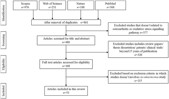 The search was carried out systematically using Preferred Reporting Items for Systematic Reviews and Meta-Analyses (PRISMA) guideline for scoping review as described elsewhere. Boolean operator guideline was used to select the appropriate keywords for article search. The selected keywords are: natural product AND oxidative stress AND osteoarthritis OR natural extract AND ROS AND degenerative arthritis OR natural plant AND free radicals AND degenerative joint disease. The articles were searched using Nature, PubMed, Scopus, and Web of Science databases. Figure 1 summarises the search strategy.