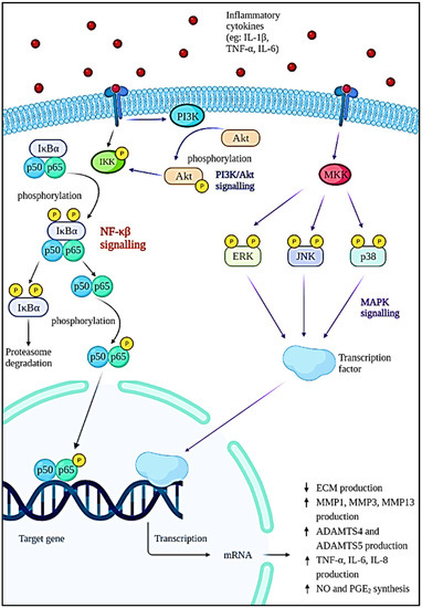 According to Xie et al. (2019), the phosphoinositide 3-kinase (PI3K)/protein kinase B (Akt) signaling is known to have a synergistic effect on the NF-κβ signaling pathway. This pathway is activated when cytokines such as IL-1β bind to their receptors on the cell surface. The phosphorylation of Akt by membrane protein PI3K will occur in response to the stimulation and cause the cell to synthesize more MMPs [37]. In addition, the mitogen-activated protein kinase (MAPK) pathway is one of the multiple signal transduction pathways in the OA progression [38]. The three signal cascades pathway of the MAPK pathway includes p38, extracellular signal-regulated kinase (ERK), and c-Jun N-terminal kinase (JNK) [39]. These are the mediator that controls the downstream MMPs and pro-inflammatory cytokines expression. Cytokines, matrix proteins, and growth factors can activate MAP kinases (MKKs) by binding to integrin, cytokine receptors, G-protein coupled receptors, and receptor tyrosine kinases. Upon binding to the cell surface receptors, signals known as ‘upstream activators’ are generated and will cause phosphorylation of specific MKKs by MAP kinase. The activated MKKs will then trigger the activation of transcriptional regulatory proteins resulting in the increased expression of inflammatory genes such as TNF-α, IL-1, and MMPs. The cytokines produced can then keep JNK activated, eventually resulting in increased production of MMPs and cytokines [40].