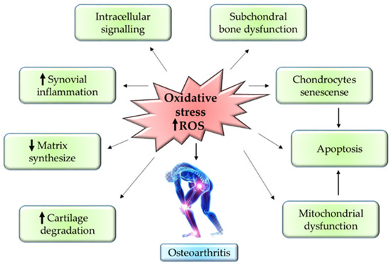 The progression of OA mainly depends on the reactive oxygen species (ROS) and oxidative stress. ROS production is one of the essential steps for the regulation of homeostasis in the chondrocytes. ROS is produced in the cells via NADPH oxidase and mitochondria in the chondrocytes. ROS usually modulates the normal expression of genes, apoptosis, synthesis of ECM, and production of inflammatory factors such as cytokines. The overexpression of NADPH oxidase enhances the build-up of oxidative stress in the joints, thereby accelerating the progression of OA [41].