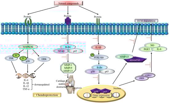 Furthermore, the function of ADAMTS4 is to mediate the degradation of aggrecan independently without the involvement of MMPs in the cartilages [130]. Therefore, the inhibition of ADAMTS4 by the natural compounds ensures a cartilage protective mechanism. In contrast, elevation in the pro-inflammatory cytokines such as IL-1, IL-6, and IL-8 is able to trigger degradation in the ECM, loss of collagen, as well as sulfated proteoglycans. Such alteration is closely associated with the inflammatory process for OA progression [131]. However, natural compounds such as edible bird’s nest [79] and genistein [91] have the ability to inhibit such catabolic factors, thus preventing the worsening of OA pathology.