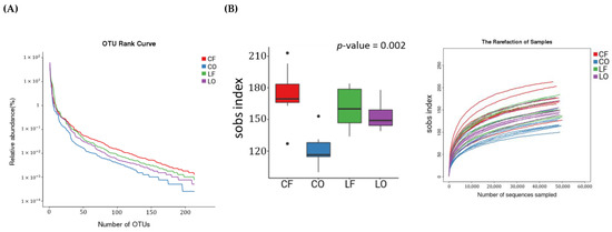 Operational taxonomic units (OTUs) are clusters of bacteria that exhibit ≥97% similarity in 16S rRNA sequences. Venn diagrams represent the comparison of the OTUs of CF, CO, LF, and LO. It was observed that there were 187 shared OTUs between all four groups. Between same fat types: CF and CO shared 212 OTUs, while LF and LO shared 235 OTUs. In general, the fresh groups CF and LF had a higher number of unique OTUs compared to the oxidized groups CO and LO, respectively (Figure 4). An OTU rank curve is constructed by calculating the relative abundance of individual OTUs in each sample and ranking them in a decreasing order. A flatter curve shape indicates greater species evenness in a group. Among all four diet groups, species evenness and richness ranked in a decreasing order was: CF > LF > LO > CO. (Figure 5A).