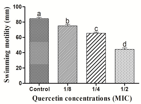 Swimming motility assay for Listeria monocytogenes mixed culture (ATCC19113, ATCC19117, and ATCC15313), with sub-MICs of quercetin (μg/mL) (control, 1/8, 1/4, and 1/2 MIC). Data represents the mean ± SEM of three independent replicates. a–d Values with different letters are significantly different by Duncan’s multiple-range test (p < 0.05).