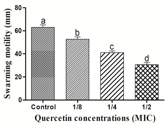 Figure 2 depicts the quercetin’s inhibition of L. monocytogenes mixed-culture swarming motility. Quercetin thereby reduced L. monocytogenes mixed-culture motility by 16 and 58% at 1/8 and 1/2 MIC, respectively. Thus, in this experiment, as the quercetin concentration increased, swimming and swarming motility became more inhibited. Particularly in comparison to the control group, motility was significantly different, with 1/8, 1/4, and 1/2 MIC of quercetin.