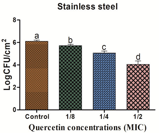 The L. monocytogenes mixed-culture biofilm on the SS coupon shown in Figure 3 was inhibited by quercetin. As the quercetin concentration increased, the biofilm-inhibiting impact grew as well. The L. monocytogenes mixed-culture biofilm inhibition values on the SS surfaces were 0.39, 1.05, and 2.07 log CFU/cm2, respectively, at quercetin quantities of 1/8, 1/4, and 1/2 MIC.