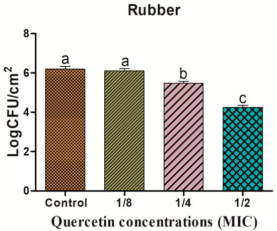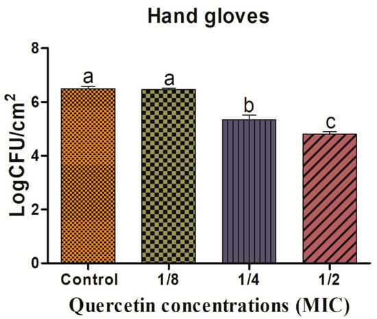 Inhibition of Listeria monocytogenes mixed culture (ATCC19113, ATCC19117, and ATCC15313) biofilm formation (24 h) on hand glove surfaces by sub-MICs of quercetin (μg/mL) (control, 1/8, 1/4, and 1/2 MIC). Data represents the mean ± SEM of three independent replicates. a–c Values with different letters are significantly different by Duncan’s multiple-range test (p < 0.05).