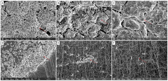 The visual confirmation of biofilm inhibition by quercetin is shown in Figure 6. The biofilms were architecturally structured, with intact cell-to-cell contacts in control samples. Smooth and regular cells with intact cell membranes were observed in both the control (Figure 6A,D) and the quercetin-supplemented groups (Figure 6B,C,E,F). The rough and uneven appearance of the quercetin-treated bacterial cells indicated that the cells had lost their usual shape (Figure 6C,F). The cells lost their usual shape due to surface attachment on the rubber surface (Figure 6D–F). The red color mark indicates the attachment of biofilm cells in both the control (Figure 6A,D) and single groups and the lysis of biofilms in quercetin-treated samples (Figure 6B,C,E,F).
