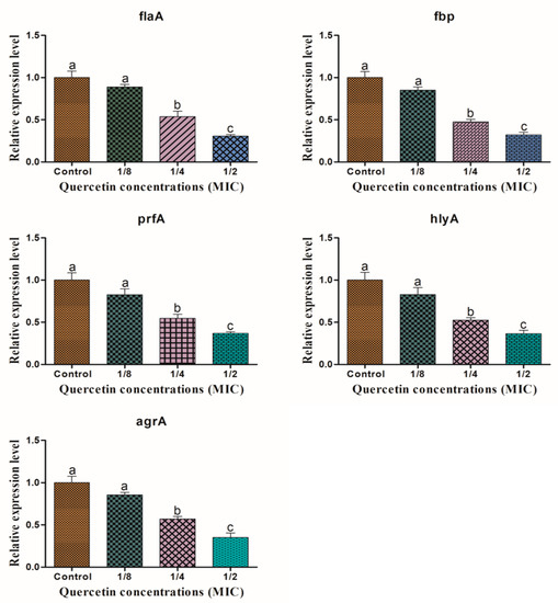Relative expression levels of flaA, fbp, prfA, hlyA, and agrA genes in Listeria monocytogenes mixed culture (ATCC19113, ATCC19117, and ATCC15313), supplemented with sub-MICs of quercetin (control, 1/8, 1/4, and 1/2 MIC). a–c Different superscript letters indicate significant differences (p < 0.05) with three independent replicates.