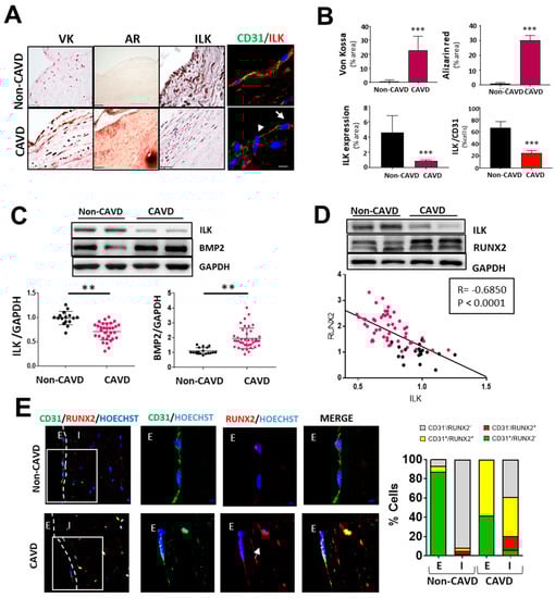 First, we analyzed the protein expression of ILK in human valve samples collected as surgical residues from patients with calcific aortic valve stenosis and age-matched non-CAVD controls. CAVD specimens with evident calcific lesion formation as detected by Von kossa and Alizarin red staining exhibited decreased ILK protein expression. In contrast, ILK was abundantly expressed in non-CAVD controls. Since CAVD pathology starts at the endothelium level, where significant hemodynamic stress occurs [15], we focused on valve endothelia to study ILK expression. Co-immunostaining of ILK and the endothelial marker CD31 detected a blunted decrease in ILK at the endothelial level (Figure 1A,B). A more in-depth study confirmed a significant negative correlation between ILK expression and valve calcification (Figure 1C). In addition, BMP2, another protein widely implicated in calcification, showed a marked increase in CAVD vs. non-CAVD valves. To control for confounding factors, we used stepwise multiple logistic regression to create a multivariate model that included age, calcification degree, ILK levels, and comorbidities related to atherosclerosis and valvular calcification, such as diabetes, hypertension, and dyslipidemia. Significant values were those the probability of which was less than 5% (p < 0.05). ILK presented a significant association with valve calcification (adjusted OR, 0.0096; SD, 0.157; p < 0.005), with dyslipidemia being equally relevant (OR, 4.63; SD, 2.71; p < 0.009). In this case, ILK proved to be a protective factor. Indeed, the expression levels of RUNX2, a marker of calcification, showed a significant negative linear correlation with ILK (Pearson’s linear correlation coefficient, −0.68; p < 0.001) (Figure 1D). Together these results showed a negative correlation between ILK expression and valvular calcification.