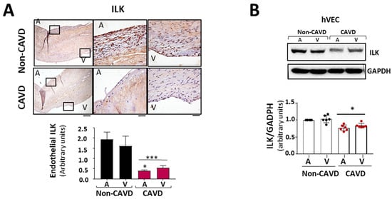 Since the aortic side of the Ao valve is the preferential site of calcification [15], we analyzed ILK expression in the endothelial layer of both sides of the valve, aortic and ventricular. Immunohistochemically, ILK staining showed decreased expression of ILK at both sides of the endothelium in CAVD vs. non-CAVD samples, but ILK expression decreased more on the aortic side (Figure 2A). To better study these phenomena, we isolated endothelial valve cells (VECs) from the aortic and ventricular sides to study them separately. Both VEC types expressed lower ILK levels compared to non-CAVD controls. However, endothelial cells isolated from the aortic side of CAVD patients exhibited lower ILK expression than those isolated from the ventricular side (Figure 2B), suggesting a possible role for ILK in the early stage of this process. Thus, hVECs isolated from the aortic side of non-calcific samples were used to study the mechanism associated with ILK loss during CAVD.