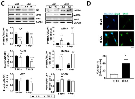 Endothelial-to-mesenchymal transition (EndMT) plays a role in the pathogenesis of CAVD [5,16]. ILK silencing for five days increased the expression and nuclear accumulation of transcription factor Snail (SNAI1), crucial for dissolution of E-cadherin junctions during EndMT, suggesting a role for ILK in the EndMT process (Figure 2C,D). Moreover, ILK silencing in hVECs (siILK-hVECs) resulted in the expression of mesenchymal cell markers α-SMA and SM22α, five and seven days after ILK depletion. At the same time, there was a progressive loss of endothelial cell markers CD31 and vWF, which was more evident seven days after ILK silencing (Figure 2D).