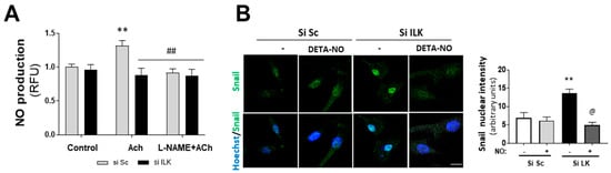 NO has been reported to inhibit spontaneous calcification in cultured porcine VICs (pAVICs) in vitro [17,18]. In addition, we previously reported that ILK indirectly interacts with eNOS, preventing eNOS from uncoupling in endothelial cells and ensuring adequate NO supply [10]. Therefore, we explored the role of NO production in EndMT induced by ILK silencing. First, we tested NO production of human VECs isolated from patients without calcification. As shown in Figure 3A, NO was increased in response to eNOS stimulation with Acetylcholine (Ach) and further prevented by the eNOS inhibitor L-NAME. However, ILK silencing for only three days decreased NO release in Ach-stimulated hVECs.