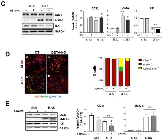 Then, we treated hVECs with an NO donor (DETA-NO) to mimic stable eNOS-NO release and studied EndMT induced by ILK silencing. DETA-NO treatment prevented Snail nuclear translocation, decrease in CD31, and increase in α-SMA at five days after ILK silencing, as detected by Western blotting and confocal microscopy (Figure 3B,C). After five days of siRNA transfection, 78 ± 2% cells conserved CD31, 5 ± 0.2% cells exhibited α-SMA and no CD31 expression, and the remaining 17 ± 3.2% expressed both markers, indicating an incomplete transition. In the presence of continuous NO supply, however, only a small fraction of cells (8 ± 0.2%) expressed both markers (Figure 3D). Next, we reasoned that if endothelial ILK effects on EndMT are produced via endothelial NO release, then decreasing endogenous NO production by eNOS inhibition with L-NAME would mimic ILK-silencing effects. L-NAME treatment induced a slight decrease in CD31 expression, further enhanced by ILK silencing. Similarly, L-NAME induced a modest increase in SM22α and potentiated ILK-silencing effects on SM22α expression (Figure 3E).
