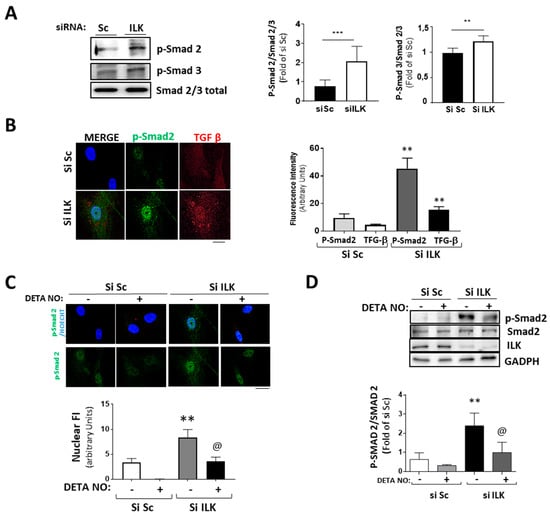 Silencing of ILK in hVECs induced EnMT through the TGF/SMAD2/3 axis in a nitric-oxide-dependent manner. (A,B) hVECs transfected with siSc or siILK for 5 days. (A) Western blot analysis and quantification of phospho-Smad2 and phospho-Smad3. *** p < 0.0001 vs. Si Sc; ** p < 0.001 vs. Si Sc (B) Immunofluorescence of phospho-Smad2 (green) and TGF-β (red) and quantification of fluorescence intensity (right). n = 6. ** p < 0.001 vs. Si Sc. (C,D) hVECs transfected with siSc or siILK and treated with DETA-NONOate for 5 days. Quantification of nuclear translocation (right). n = 6. ** p < 0.001 vs. Si Sc. (C) Confocal fluorescent microscopy images of phospho-Smad2. (D) Western blot analysis of phospho-Smad2 and quantification. n = 6. ** p < 0.001 vs. Si Sc; @ p < 0.001 vs. Si ILK.