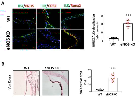 eNOS knock-out mice exhibited valve calcification, which correlates with low levels of ILK expression and increased RunX2 in valve endothelium. (A) Confocal microscopy image of endothelial marker IB4 in green and eNOS in red (left panel); ILK in green and endothelial marker CD31 in red (central panel); and ILK in green and Runx2 in red (right panel) in eNOS KO mice vs. WT. On the left, quantitation of ILK/RUNX2 colocalization in valve endothelium. N = 8. *** p < 0.0001 vs. WT. (B) Von Kossa staining in aortic valves of WT and eNOS KO mice. Scale bar = 50 μm. A quantification of VK positive area with respect to total area is shown below. n = 11. *** p < 0.0001 vs. WT.