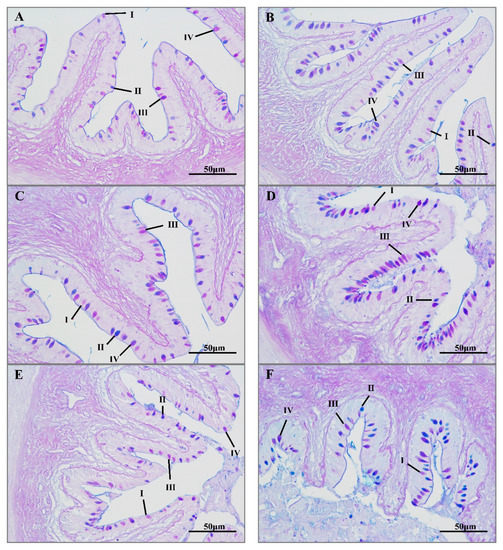 Alcian blue-periodic acid-Schiff staining (AB-PAS) of hybrid yellow catfish intestine under transport stress. Intestine mucous cells at different transport times 0 h (A); 2 h (B); 4 h (C); 8 h (D); 16 h (E); 96 h recovery group (F). Ⅰ, Ⅱ, III and Ⅳ represent different mucous cell types.
