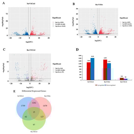 We identified the DEGs in pairwise comparisons between the Ctrl, Str, and Rec libraries using the screening criteria: |log2(foldchange)| ≥ 1, p < 0.05. We identified 3134 DEGs (1383 up-regulated and 1751 down-regulated) between the Str and Ctrl libraries; 2883 DEGs (1579 up-regulated and 1304 down-regulated) between the Rec and Str libraries; and 301 DEGs (183 up-regulated and 118 down-regulated) between the Rec and Ctrl libraries (Figure 3A–D). A Venn diagram shows the number of DEGs in each comparison (Figure 3E).