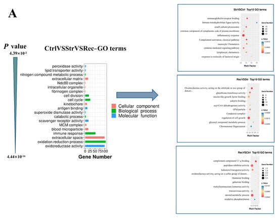 The DEGs were grouped into molecular function (MF), cellular component (CC), and biological process (BP) categories in the GO enrichment analysis (Figure 4A). In the Ctrl vs. Str vs. Rec comparison, the MF subcategories most enriched with DEGs were oxidoreductase activity, chemokine activity, and interleukin-1 receptor binding; the CC subcategories most enriched with DEGs were extracellular space, extracellular region, and the external side of the plasma membrane; and the BP subcategories most enriched with DEGs were oxidation-reduction process, immune response, and metabolic process. In the Str vs. Ctrl comparison, the MF subcategories most enriched with DEGs were chemokine activity, tumor necrosis factor receptor binding, and immunoglobulin receptor binding; those in the CC category were extracellular space, the external side of the plasma membrane, and blood microparticle; and those in the BP category were defense response to bacterium, inflammatory response, and immune response. In the Rec vs. Str comparison, the MF subcategories most enriched with DEGs were oxidoreductase activity, acting on the aldehyde or oxo group of donors, NAD or NADP as acceptor, and aldehyde dehydrogenase (NAD) activity; those in the CC category were extracellular region, chylomicron, and MCM complex; and those in the BP category were metabolic process, oxidation-reduction process, and mitotic chromosome condensation. In the Rec vs. Ctrl comparison, the MF subcategories most enriched with DEGs were complement component C1q binding, virion binding, and peptidase inhibitor activity; those in the CC category were condensed chromosome outer kinetochore, blood microparticle, and intermediate filament; and those in the BP category were cholesterol metabolic process, the positive regulation of nitric oxide biosynthetic process, and the negative regulation of exo-alpha-sialidase activity.