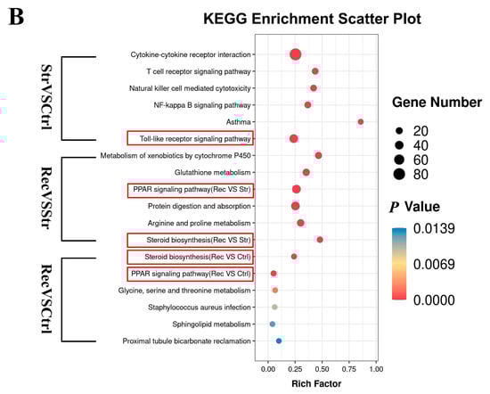 We conducted a KEGG pathway enrichment analysis for the DEGs in the Ctrl vs. Str vs. Rec comparisons. The results revealed that the transport treatments mainly affected the immune and metabolic pathways (Figure 4B). The Toll-like receptor signaling pathway (TLRs), peroxisome proliferator-activated receptor (PPAR) signaling pathway, and steroid biosynthesis pathway were enriched with DEGs in the Ctrl vs. Str vs. Rec comparisons. In addition, 52, 45, and 12 signaling pathways were enriched with DEGs in the Str vs. Ctrl, Rec vs. Str, and Rec vs. Ctrl comparisons, respectively. The pathways most significantly enriched with DEGs in Str vs. Ctrl were immune-related signaling pathways such as the cytokine–cytokine receptor interaction and the TLRs signaling pathway. In Rec vs. Str, the pathways significantly enriched with DEGs were metabolic signaling pathways such as the PPAR signaling pathway and protein digestion and absorption. Fewer pathways were significantly enriched with DEGs in the Rec vs. Ctrl comparison. Those significantly enriched with DEGs were metabolic signaling pathways such as steroid biosynthesis and the PPAR signaling pathway.