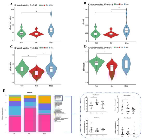 (A) Observed species index; (B) Chao1 index; (C) Shannon’s index; (D) Simpson’s index; (E) relative abundance of predominant taxa identified at phylum level in control group (Ctrl), transport 16 h group (Str), and recovery group (Rec). Each bar represents relative abundance in each group and 20 most abundant taxa are shown. Relative abundance of four dominate bacterial phyla in three groups showed in (a–d). Each shape represents relative abundance in each sample. * (p < 0.05) and ** (p < 0.01) indicate significant difference in abundance.