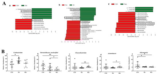 The abundance of bacterial taxa was compared among the Ctrl, Str, and Rec groups by a LEfSe analysis (Figure S2). At the genus level (Figure 7A), bacteria with high relative abundance such as Cetobacterium, Barnesiellaceae, Chryseobacterium, Acinetobacter, and Akkermansia differed among the three groups (Figure 7B). The abundance of Cetobacterium was higher in the Str group than in the Ctrl group, but similar between the Rec and Ctrl groups (Figure 7B(a)). The abundance of Barnesiellaceae was slightly lower in the Str group than in the Ctrl group, and markedly lower in the Rec group than in the Ctrl group (Figure 7B(b)). The abundance of Chryseobacterium and Acinetobacter was not significantly different between the Str and Ctrl groups but was significantly higher in the Rec group than in the Str group (Figure 7B(c,d)). Akkermansia showed significantly decreased abundance in the Str and Rec groups compared with the Ctrl group (Figure 7B(e)).