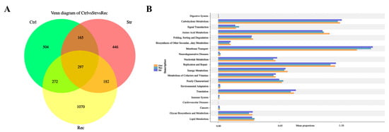 As shown in Figure 8A, the Str group had the fewest OTUs and the Rec group had the largest number of exclusive functional OTUs. At KEGG level 2 (Figure 8B), the most enriched categories of intestinal microbial function in the Ctrl, Str, and Rec groups were “membrane transport”, “carbohydrate metabolism”, “amino acid metabolism”, “replication and repair”, and “translation”.
