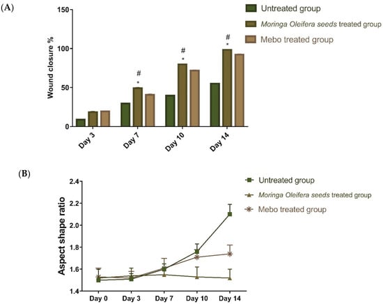 (A). Wound closure rates over time post-injury in all investigated groups. Group 1 was left untreated (-ve control). Group 2 received Moringa oleifera seeds extract. Group 3 received MEBO® (marketed treatment- + ve control over 0, 3, 7, 10, and 14 days). After normalizing the variables using the Shapiro–Wilk test, a two-way ANOVA test was used to examine significant differences between groups. The expression of the data was expressed as mean ± SD. In comparison to the respective day’s untreated group, * p < 0.001; in comparison to the respective day’s MEBO® group, # p < 0.001. (B) Wound aspect ratio was determined to describe observed changes in the shape and direction of wound contraction between groups (length:width).