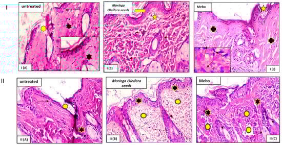 Wounded skin 7 (I-top) and 14 days (II-down) after incision. (I) Group I (A) (untreated): Showing a normal edged wound with normal epidermis (arrow). The wound is packed with blood clots (asterisk), which are highlighted by sloughed granulation tissue and dense uneven collagen bundles (star). Group I (B) (Moringa oleifera seeds extract) exhibited significant re-epithelization (thick arrow). The granulation tissue filling the defect’s base (from below) is mostly cellular (star). Collagen bundles manifested as disordered coarse and wavy bundles (arrows). Group I (C) (MEBO®): Scar tissue obstructing the wound (star). Collagen bundles form a reticular pattern around the defect, similar to that of the nearby normal dermis (crosses). The inset depicts inflammatory cellular infiltration, primarily of macrophages (black arrows). (II) Group II (A) (left untreated): Wide wound area (stars) with substantial inflammatory cellular infiltration in an acidophilic matrix (asterisks) and normal skin (arrows). Group II (B) (Moringa oleifera seeds extract): Typical stratified squamous keratinized epithelium (stars) and dermal matrix with coarse wavy collagen bundles pointing in various directions (asterisks). The freshly created hair follicles (arrows). Group II (C) (MEBO®): Typical epithelium, thin scar tissue extending into the dermis (stars), and reticular dermis with coarse wavy collagen bundles organized in different orientations are all visible (asterisks), and newly formed hair follicles (arrows). (Hx and E stain × 200 and 400).