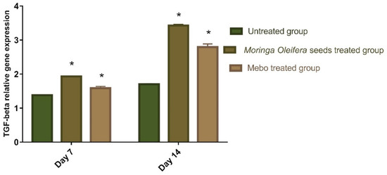 Figure 4 depicted the mRNA expression of TGF-β following excisional wound therapy with Moringa oleifera seeds extract and MEBO®. TGF-β mRNA expression in skin tissues was substantially higher in wounds treated with M. oleifera seeds extract for 7 to 14 days compared to the untreated groups (p < 0.001). The relative gene expression of M. oleifera seeds extract-treated wounds showed a significant rise in the markers expression as compared to the MEBO®-treated group. The complicated connections between cells and the multiple growth factors are necessary for wound healing [38]. The most critical point of wound healing phases is when TGF-β recruits and activates inflammatory cells like neutrophils and macrophages during the hemostasis and inflammation phase. However, during the proliferative phase, it induces a variety of cellular responses, including re-epithelialization, angiogenesis, the development of granulation tissue, and the deposition of extracellular matrix [39,40]. During the remodeling phase, it promotes fibroblasts to grow and differentiate into myofibroblasts, which aid in wound closure [39,41,42]. Chronic non-healing wounds often result in a failure of TGF-β warning, whereas Feinberg and his colleagues [43] reported that TGF-β has an inhibitory impact on the production of collagenases that degrade collagen and extracellular matrix. These are coherent with the above measurements, which established that M. oleifera seeds extract enhanced TGF-β expression and hence recovered wound healing. The mRNA gene expression investigation of the injured tissues produced an increment in TGF-β levels in M. oleifera seeds extract-treated wound tissues relative to the untreated wound tissues. This may recommend that M. oleifera seeds extract upregulates the expression of TGF-β in the wound tissues.