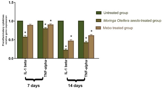 Moreover, M. oleifera seeds extract or MEBO® treatment over 14 days showed a significantly decrease in TNF-α and IL-1β mRNA expression when compared to the untreated group at (p < 0.001). The expression of TNF-α and IL-1β in wounds treated with M. oleifera seeds extract were significantly lower than in the group treated with MEBO®. Pro-inflammatory cytokines (IL-1β and TNF-α) must be expressed appropriately to recruit neutrophils to the wound site. They are also identified as dynamic inducers of metalloproteinase (MMP) production in inflammatory and fibroblast cells. MMP destroys and eliminates damaged extracellular matrices (ECM) during wound healing to help in wound repair [44]. However, a prolonged inflammatory phase interferes with the healing process, and these cytokines and proteinase harm the tissue and contribute to the formation of chronic wounds [45].