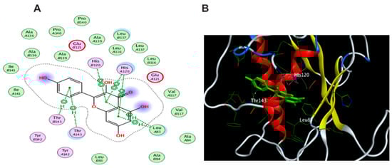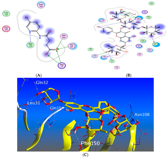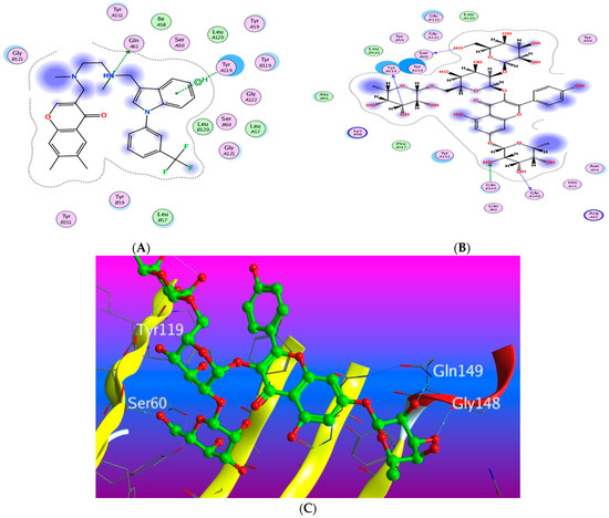 The dock score of the 19 compounds against 2AZ5 is summarized in (Supplementary Table S2). Docking results revealed that only compound 15 achieved a docking score of −7.544 kcal/mol better than the energy score of the co-crystallized ligand, with more hydrogen bond interactions than the isolated ligand as it showed three hydrogen bonds with Ser 60, Tyr 119, and Gly 148 through the hydroxyl groups of the glucopyranosyl and rhamnopyranosyl moieties in addition to one more hydrogen bond between the oxygen atom in the 7-rhamnopyranosyl moiety and Gln 149. The rest of the compounds showed lower affinity towards the protein than the ligand-like compound 8, which showed one hydrogen bond interaction and another H-pi interaction in addition to compounds 4, 7, and 18 which exhibited two hydrogen bond interactions.